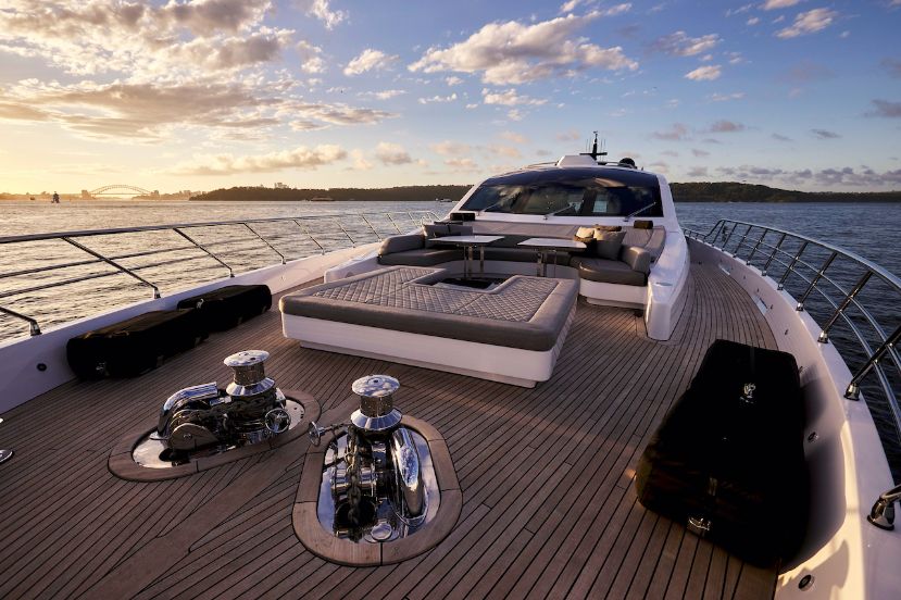 The aft deck is also a popular gathering space to enjoy a sit down meal or maybe unwind on the ample L-shaped corner lounge. Entertainment has also been considered at the core design of the aft deck, with tv-screens set behind the lounges. Protection from the elements is assured, where a custom deployable sun shade sail is fitted. Take in the breathtaking views from your very own private beach club on One O One. Feel the sun caress your body and warm your soul as you relax in one of the sizeable low-slung deck chairs with a cold glass of champagne overlooking the harbour.